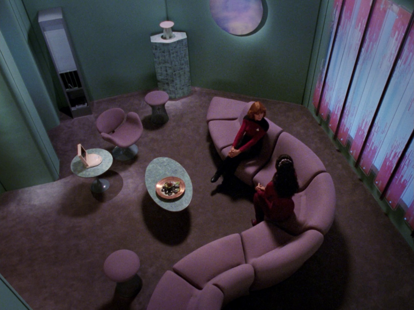 My least favorite character as a kid was Counselor Troi, called by my entire family at the time “Counselor Cleavage” due to her amazingly unprofessional early show attire. It is interesting how the writers made her better once Captain Jellicoe made her put on a real uniform. We went from “Captain, I sense anger” in response to some enemy ship threatening to fire on the Enterprise to actually being one of the funnier (intentionally) characters in later seasons. Even so, true 90s kids know Marina Sirtis’ best role was actually as Demona. Plus, her office perfectly encapsulates the nostalgic vaporwave interior of the Enterprise-D.