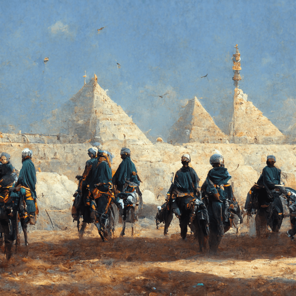 Mamluk Cavalry Riding Amongst the Pyramids of Egypt- art generated using Midjourney