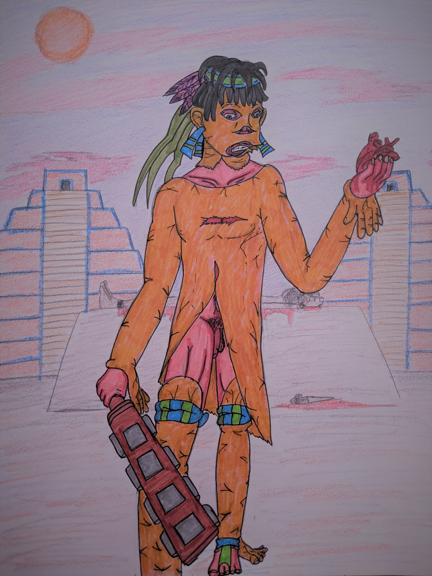 Priest of Xipe Totec, the flayed god of agriculture, warfare, and renewal, also called ‘The Night Drinker’. At certain sacrificial events these guys would cut the hearts out of victims, flay the flesh, and create a skin suit out of it to then dance around for a few days. At the end of the ceremony they would strip off the rotting human pelt and bury them under the main temple in jars. This represented Xipe Totec’s shedding of his own skin of foliage with the seasons and bringing about the renewal of the next corn crop.